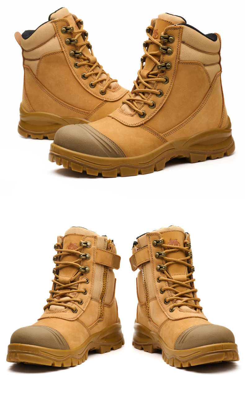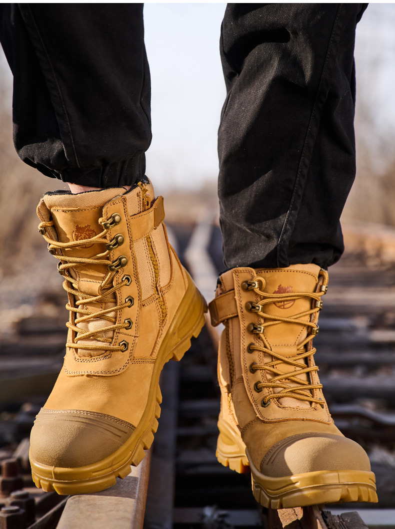 High-end protective footwear with top-grain leather, high-top design, side zipper, steel toe cap, protection against crushing and punctures, slip-resistant, and durable work shoes for men.